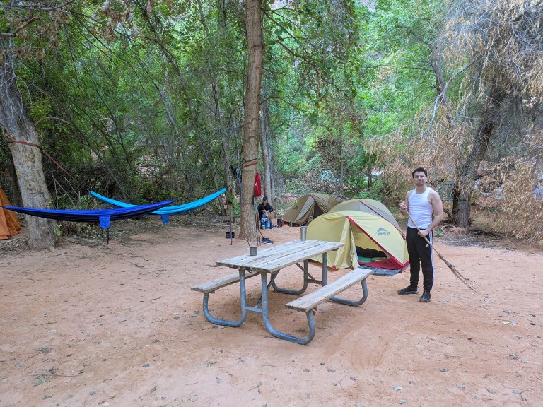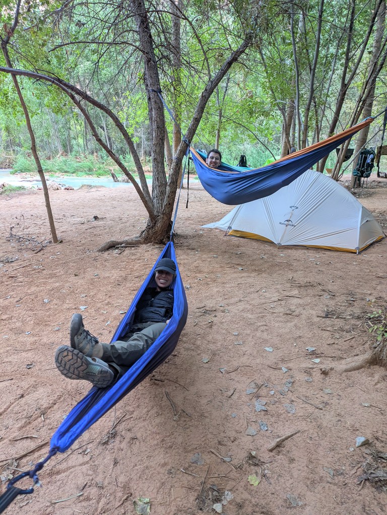 The camping area began just past Havasu Falls, and without having to walk much farther we found a nice spot – plenty of flat ground, close (but not too close) to the composting toilets, not far from the drinking water spring, with a good view of the creek. We set up our tents and hung our hammocks.