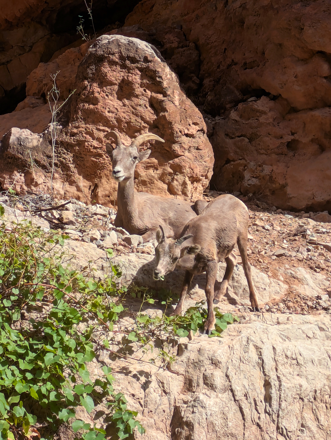 The stretch between Mooney Falls and Beaver Falls is a wonderland of pale blue-green water cascading over countless travertine terraces. I’ve never been able to do it justice with photos. The trail crosses the creek repeatedly and sometimes takes you up and down rickety ladders that have been jury-rigged into the canyon walls. At one point Chris spotted a bighorn sheep ewe and lamb watching us from a rocky shelf.