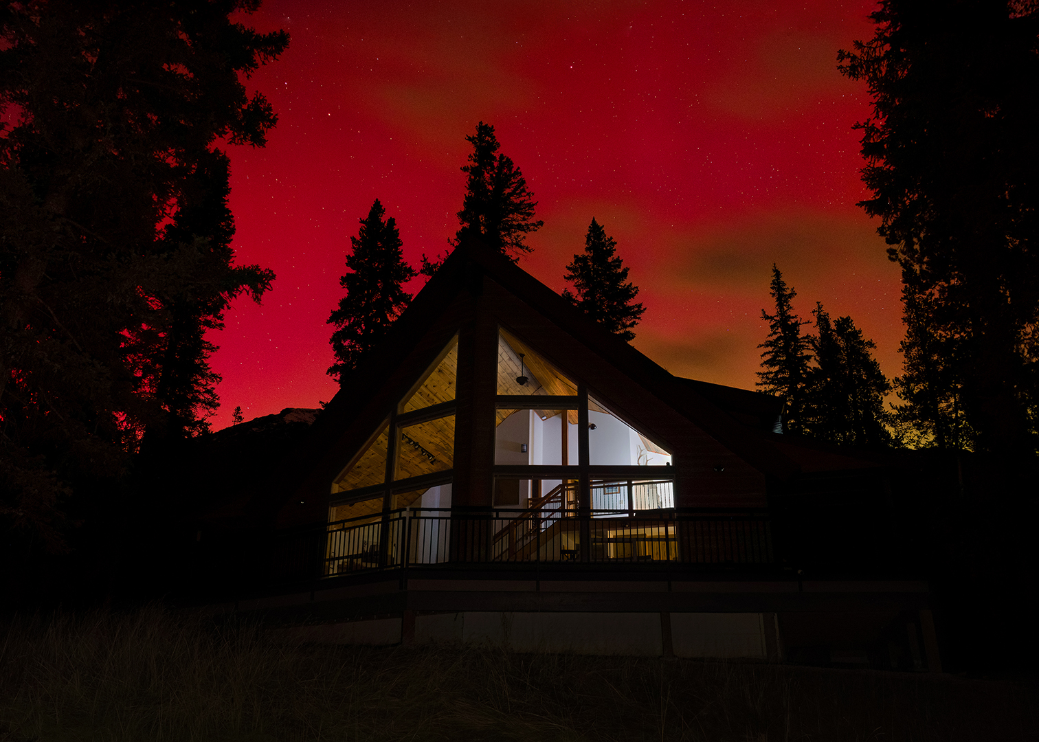 Turns out I didn’t need a reminder. It gets dark early in Silver Gate in November, and as I was making dinner around 6pm I noticed an eerie red glow seeping through the kitchen window. “Check out the sky!” I yelled to Marie, who began taking iPhone photos from our bedroom. Meanwhile I scrambled to put on warm clothes, gather up my camera and tripod, and stumble through the darkness to find a spot in our yard with a good view of our house and the sky, which had been transformed into a sea of scarlet radiance, dazzling even to the naked eye.