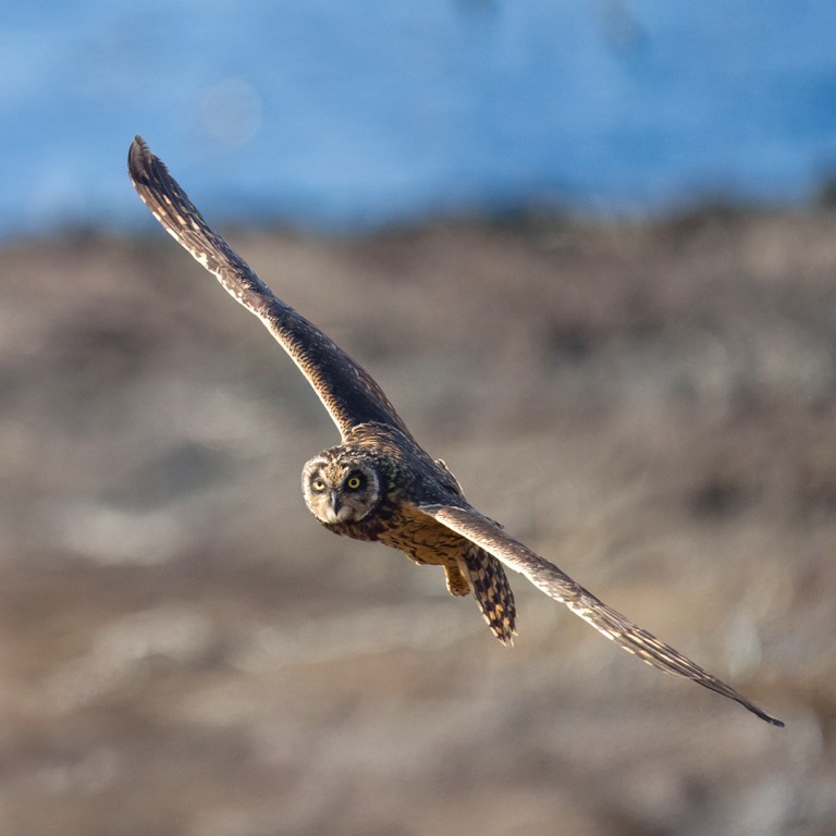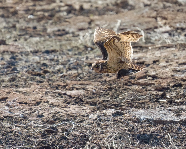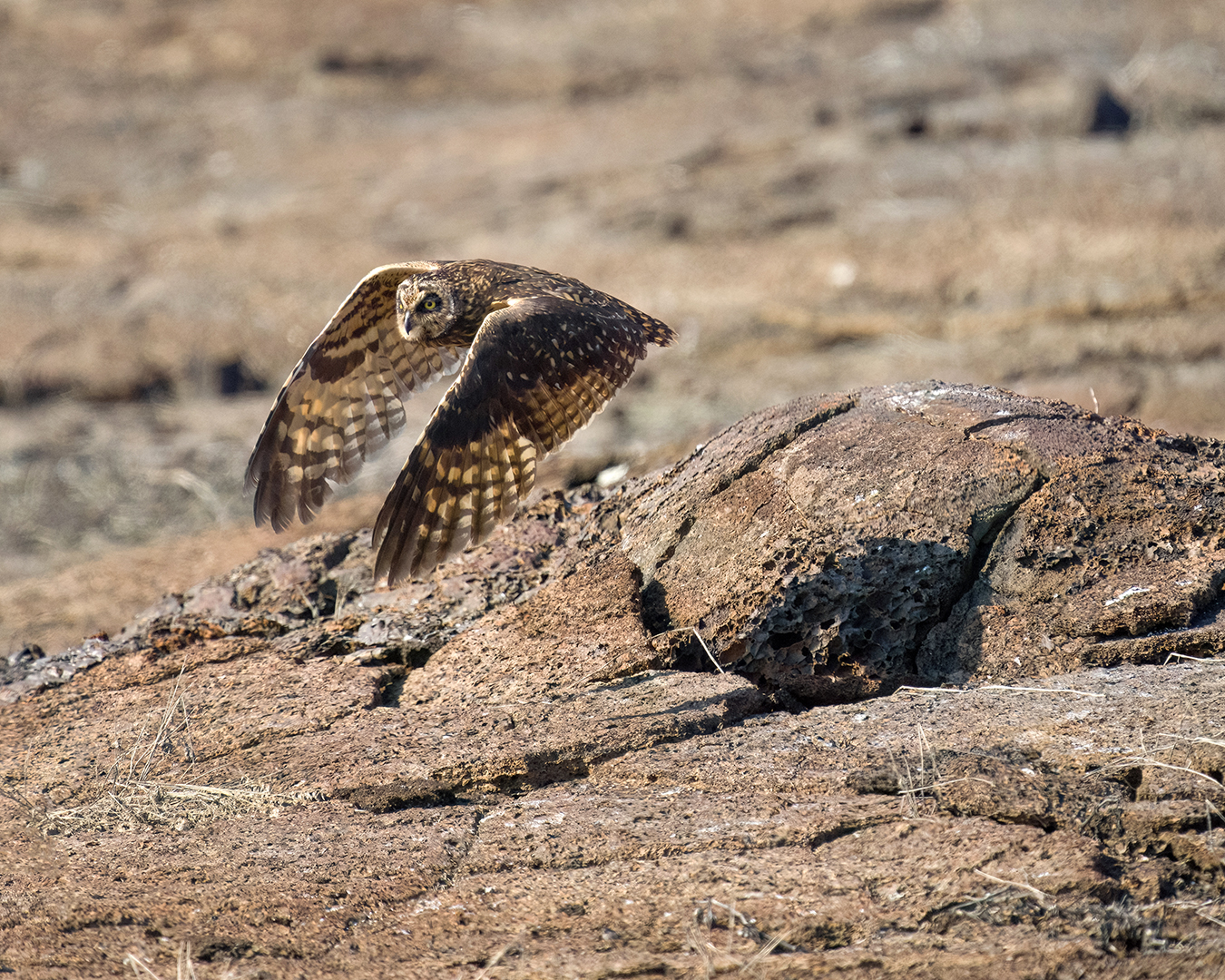 Finally, after what felt like an eternity, we reached the strip of lava rocks. As Carmen began another lecture, I spotted a short-eared owl perched out in the open, not close but not too far. I hurried into position, got a bead on the owl, and waited with my finger tensed on the shutter, telepathically begging the owl to take flight. Which it did! I fired off my shots and hoped I didn’t screw anything up.
